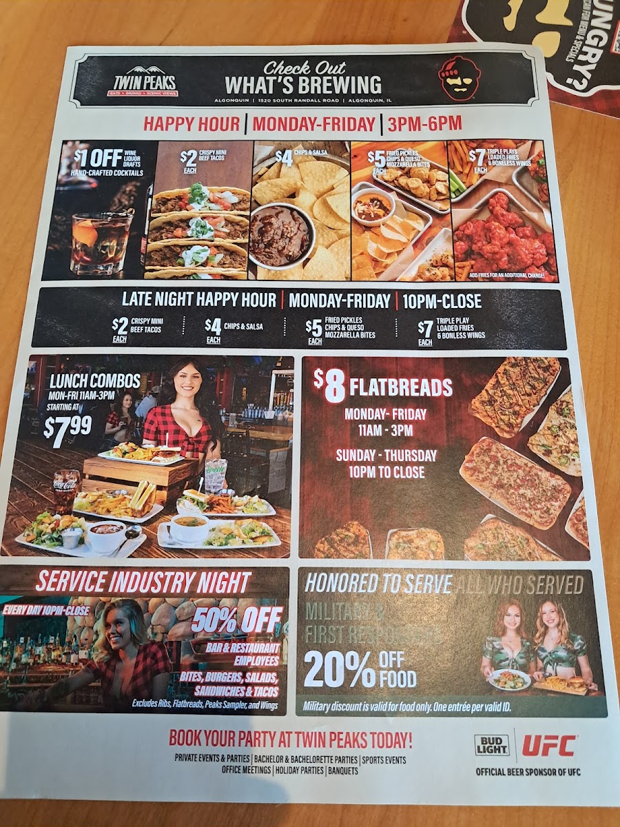 **About Twin Peaks Algonquin**Nestled at 1520 S Randall Rd, Twin Peaks Algonquin is a vibrant dining destination known for its lively atmosphere and exceptional service. Guests have raved about the restaurant's outstanding dishes, notably the boneless wings and lobster mac, which have garnered praise from even the most discerning palates. The attentive staff, led by managers who care genuinely about customer satisfaction, enhances the experience, making visitors feel like family. Whether celebrating a special occasion or unwinding after a long day, Twin Peaks Algonquin promises unforgettable meals and an inviting ambiance that beckons diners back time and again.